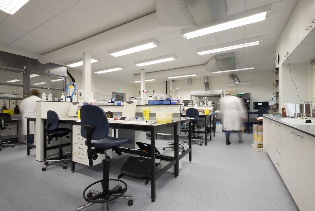 Omdat een deel van het bestaande laboratorium van bouwdeel F gespaard moest worden, liggen de laboratoriumruimtes verspreid over de bouwdelen F en K. In bouwdeel K is de bestaande situatie geheel gesloopt, terwijl we in bouwdeel F zoveel mogelijk van de bestaande wanden- en installatiestructuur intact hebben gelaten. Het grote lab op K2 heeft een heldere functionele opbouw met een hoofdpad over de volle lengte en dwarspaden haaks daar op. Op de kop van het lab en aan de hoofdas ligt de monsterinname met een zichtrelatie op en van het lab. Aan de hoofdas wordt in principe zo min mogelijk gewerkt, daartoe zijn op de koppen van de langs de dwarspaden geplaatste labtafels halfhoge wandjes geplaatst, zodat gezien vanaf de hoofdas een heldere beëindiging van de labtafels ontstaat waarbij de wat rommelige aanblik van de werkplekken wordt afgeschermd en de hoofdas wordt benadrukt.